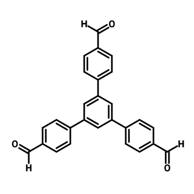 1,3,5-Tris(4-formylphenyl)benzene (CAS number 118688-53-2) is a ligands with a triphenylbenzene core functionalized with three aldehyde groups. 1,3,5-Tris(4-formylphenyl)benzene readily reacts with amine derivatives for imine linkage COFs that are used for CO2 capture. One example of such a COF is benzothiazole COF, which is prepared using this method. This COF exhibits a surface area of 328 m2/g with CO2 adsorption of 7.8 wt% at 273 K/bar. It also demonstrates excellent thermal stability up to 450 °C under a N2 atmosphere.