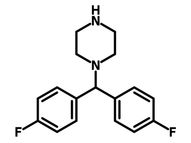 1-Bis(4-fluorophenyl)methyl piperazine (CAS number 27469-60-9), also referred to as difluorobenzhydrylpiperazine, has a piperazine connecting to a diphenylmethane with two fluorine atoms at para-positions. 1-Bis(4-fluorophenyl)methyl piperazine appears in synthesis of drugs such as flunarizine and lomerizine. The diphenylpiperazine drugs are typically classified as calcium antagonists (calcium channel blockers) and used clinically for the treatment of migraines. The synthesis involves a one-step reaction of 1-bis(4-fluorophenyl)methyl piperazine with the halogenated analogs of the second fragments via nucleophilic substitution.