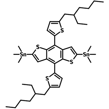 Bearing two ethylhexyl alkyl side chains, with fused thiophenes and thiophenes as electron-rich pendants, 2,6-bis(trimethytin)-4,8-bis(5-(2-ethylhexyl)thiophen-2-yl)benzo[1,2-b:4,5-b’]dithiophene offers good solubility for synthesis of polymer chains.