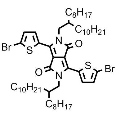 The monomer, 3,6-bis(5-bromothiophen-2-yl)-2,5-bis(2-octyldodecyl)pyrrolo[3,4-c]pyrrole-1,4(2H,5H)-dione, CAS Number 1260685-63-9, contains a DPP moiety. DPP backbone derivatives as a strong acceptor unit, have a planar conjugated bicyclic structure engaging stronger π–π interactions which allows tuning the band-gap and energy-level of polymer organic semiconductors. Also long alkyl chains, namely 2-octyldodecyl, will allow better solubility for the polymer semiconductor and crystallization and aggregation capacity for the thin-film devices. DPP-containing polymers are considered promising materials for optimizing the performance of organic semiconductors.