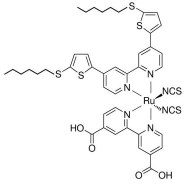 | Full name | Cis-Bis(isothiocyanato)(2,2′-bipyridyl-4,4′-dicarboxylato)(4,4′-bis(5-(hexylthio)thiophen-2-yl)-2,2′-bipyridyl)ruthenium(II) |