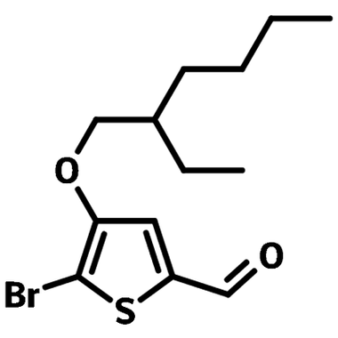 5-Bromo-4-((2-ethylhexyl)oxy)-2-thiophenecarboxaldehyde (EHOThCHO-Br), CAS number 2055812-54-7, is a thiophene derivative with multiple functional groups around the thiophene ring. Both bromo and aldehyde functional groups at 2,5-positions enable C-C formation to grow the chain length and extend its conjugation in the targeted semiconducting molecules. Ethylhexyloxyl group is there not only to enhance the solubility but also to lower the HOMO/LUMO energy levels of the targeted molecules. Comparing with the molecules bearing ethylhexyl group, molecules with ethylhexyloxyl side chains extend their absorption further to near infrared (NIR) region. 5-Bromo-4-((2-ethylhexyl)oxy)-2-thiophenecarboxaldehyde is a widely used building block that is used for the synthesis of ultra-narrow band-gap non-fullerene acceptors (NFAs) such as IEICO, IEICO-4F and IEICO-4Cl.