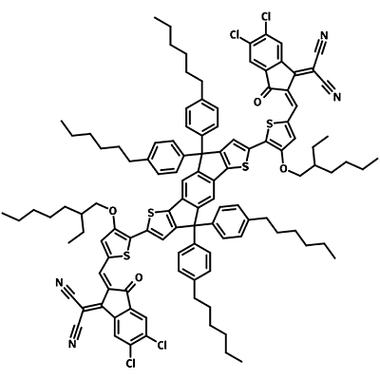 | Full Name | 2,2′-((2Z,2′Z)-(((4,4,9-tris(4-hexylphenyl)-9-(4-pentylphenyl)-4,9-dihydro-s-indaceno[1,2-b:5,6-b dithiophene-2,7-diyl)bis(4-((2-ethylhexyl)oxy)thiophene 5,2-diyl))bis(methanylylidene))bis(5,6-dichloro-3-oxo-2,3-dihydro-1H-indene-2,1-diylidene))dimalononitrile |