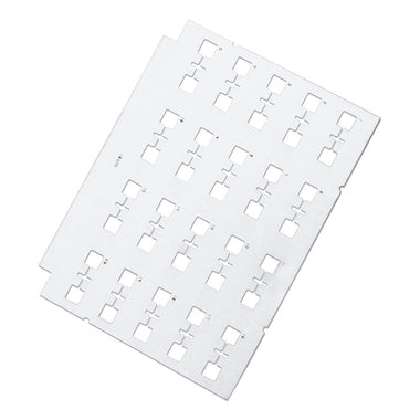 Shadow masks for deposition of source-drain contacts. Designed for use in the Evaporation Stack for High Density OFETs with our standard sized substrates of 20 mm x 15 mm. Each mask produces 20 OFETs on a single substrate. We sell a selection of masks for different precisions in linear and interdigitated patterns.