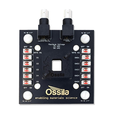 - Twin BNC connectors for easy connection to source measure units (SMUs). Channel B is used for the source or drain connection while channel A measures the gate connection.