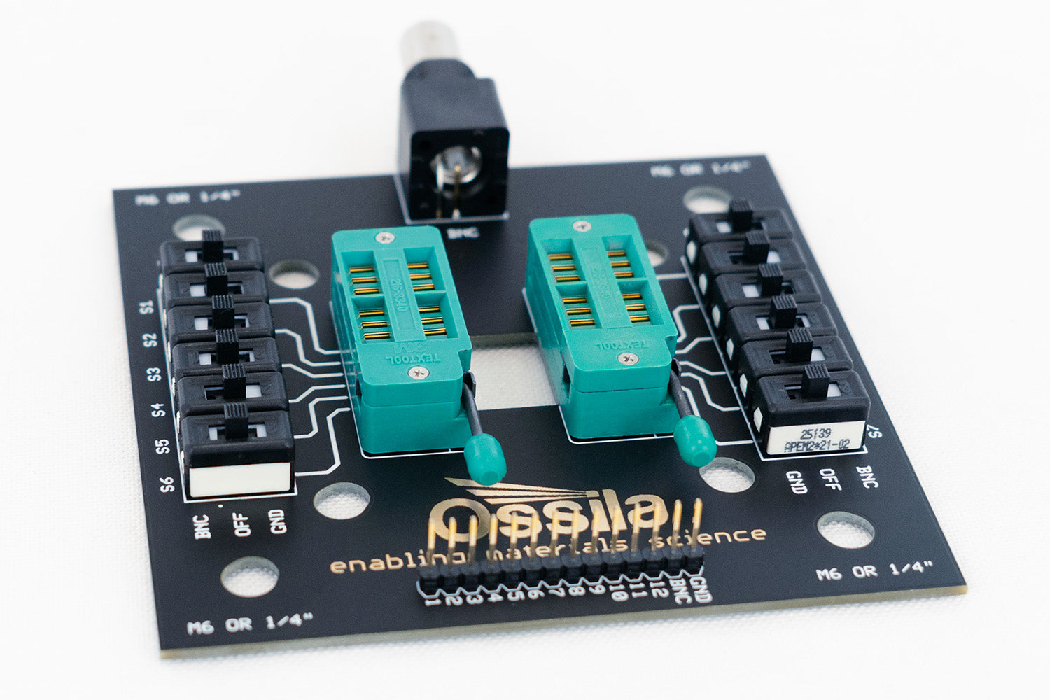 Designed for use with Ossila's edgeless 8 pixel substrate system (S211/S213) or pixelated anode substrate system (S101/S103), this test board allows for easy electrical connection and measurement.