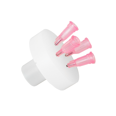 The kit contains PTFE tubing with Luer Lock adapters for quick connection to syringes. It also comes with a pack of blunt Luer Lock needles for accurate dispensing. Most importantly, the kit includes an adapter that sits in the hole on the lid of the Ossila Spin Coater to hold and position the needles to point directly at the center of the spinning substrate. For precise manual deposition, the adapter has a small central hole which will fit a pipette.