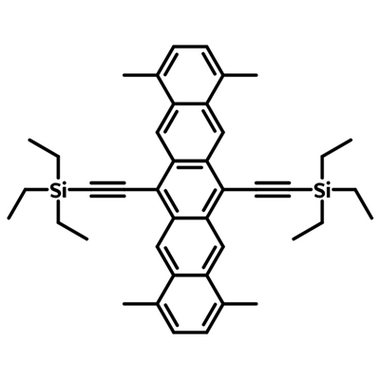1,4,8,11-tetramethyl-6,13-triethylsilylethynyl pentacene also known as TMTES-Pentacene. It is a soluble derivative of Pentacene [1], achieving mobilities of up to 4.34 cm2/Vs. TMTES-Pentacene is an ideal small-molecule semiconductor for both device fabrication and investigating the charge transport of solution-processed crystal semiconductor [4]. Mobilities of 3.5 cm2/Vs have been measured when spin coated using CYTOP© as the gate dielectric [2], and mobilities of up to 4.34 cm2/Vs have been achieved when used with high-permittivity polymer binders [3].